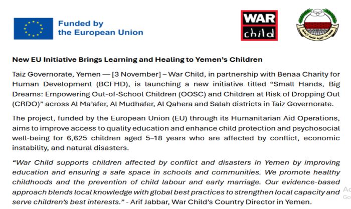A new initiative titled “Small Hands, Big Dreams: Empowering Out-of-School Children (OOSC) and Children at Risk of Dropping Out (CRDO)” was launched in Taiz governorate by War Child, in partnership with Benaa Charity for Human Development (BCFHD.